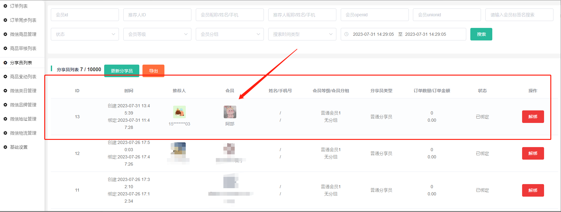 分享员绑定后会有一条信息记录,如绑定了没有显示可以点击更新分享员