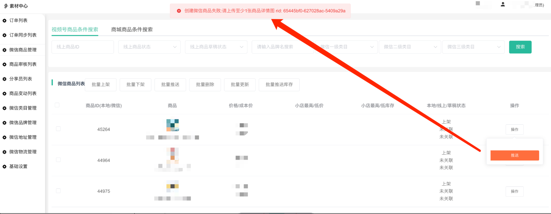 注意:推送若提示创建微信商品失败:请上传至少1张商品详情图,原因是商品挂件视频号小店要上传好详情图。