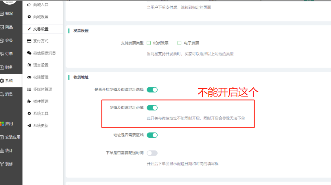 注意:视频号小店调用的是微信地址,没有街道的,不建议商城开启了这个设置,否则会导致商城创建不了订单。