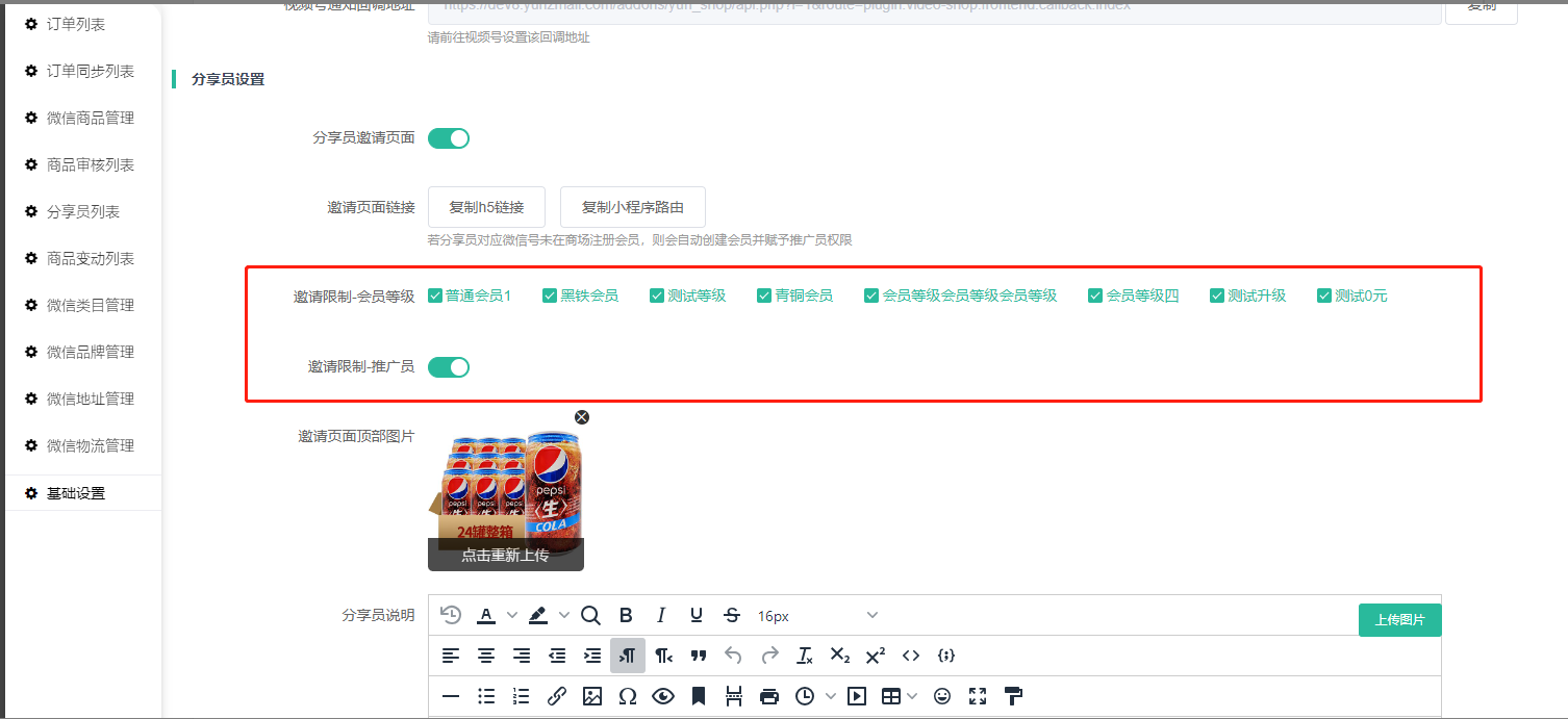 邀请限制-推广员:开启推广员,是推广员身份才可以申请为视频号分享员,如未勾选的等级进行申请则会提示未满足需求.