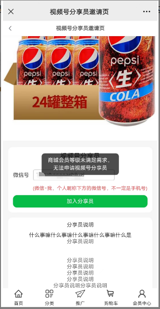 3)邀请限制-会员等级:勾选的会员等级才可以申请为视频号分享员,如未勾选的等级进行申请则会提示满足需求.