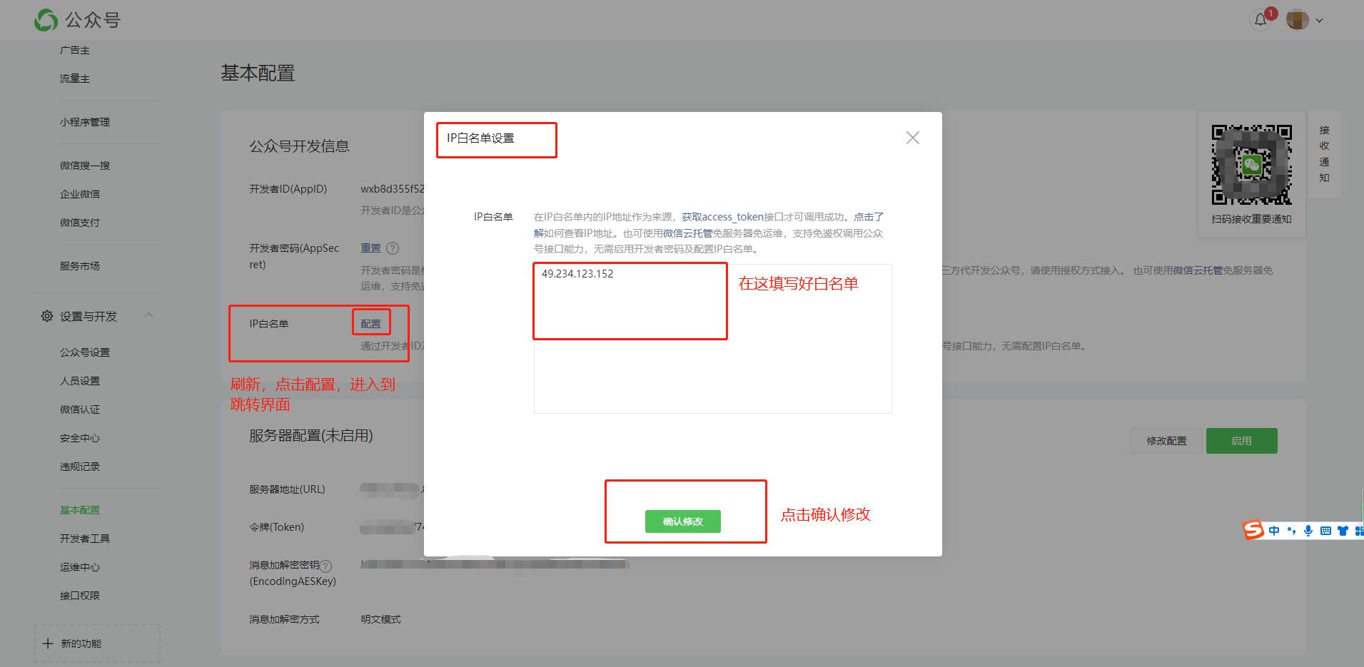 2:点击基本配置,填写开发信息和服务器配置,先设置好密钥、白名单再进行服务器配置。