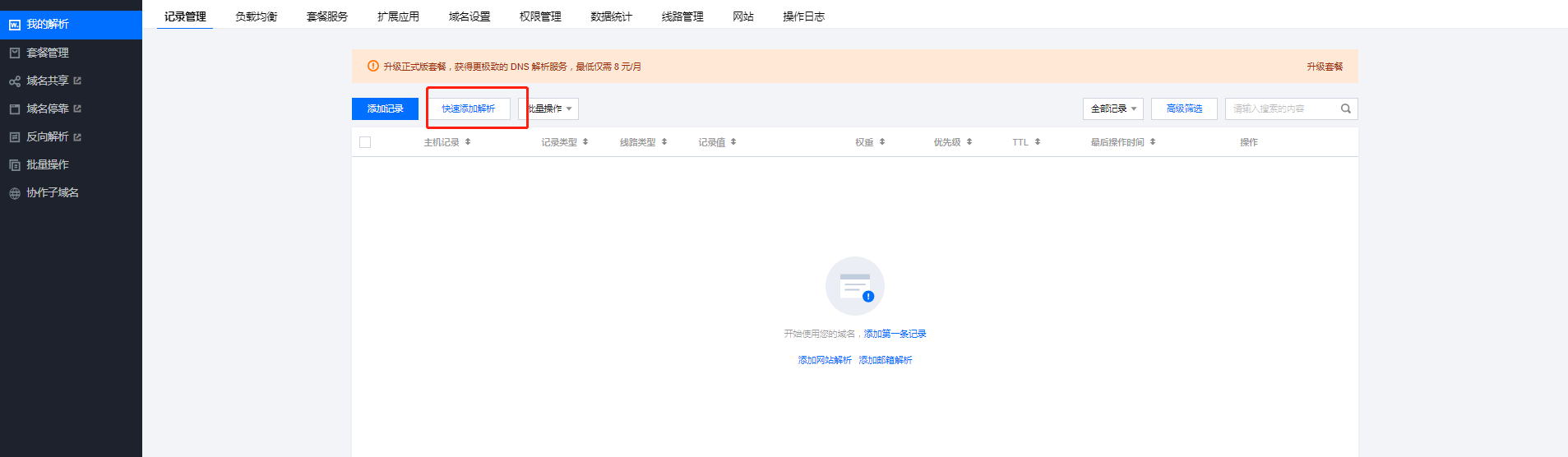1、登录 DNSPod 管理控制台 快速添加解析。如下图所示: